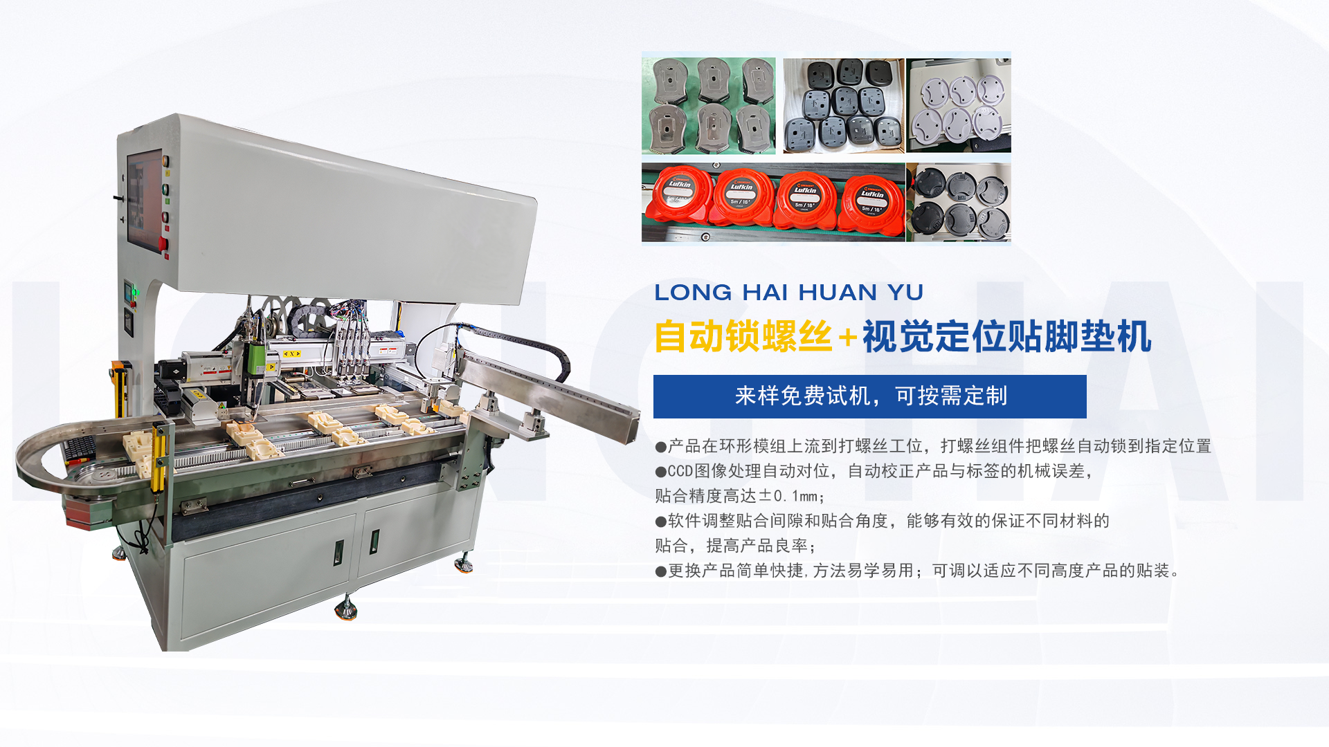 設(shè)備主要用于EVA膠墊、橡膠腳墊、泡棉腳墊、鐵氟龍腳墊的高精度貼裝。